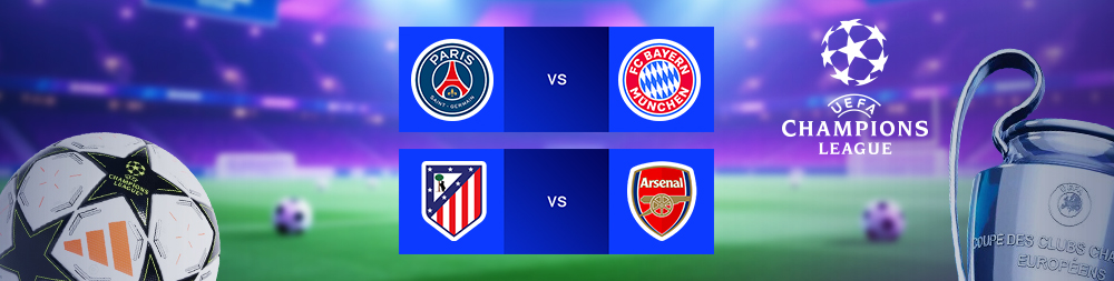 Acompanha os emocionantes confrontos das meias-finais da Liga dos Campeões desta semana: PSG - Bayern Munique e Atl. Madrid - Arsenal. Desfruta de maior tranquilidade com uma apetecível Aposta Sem Risco de 50% até 200€!